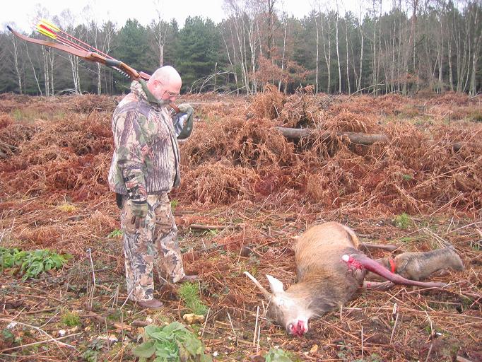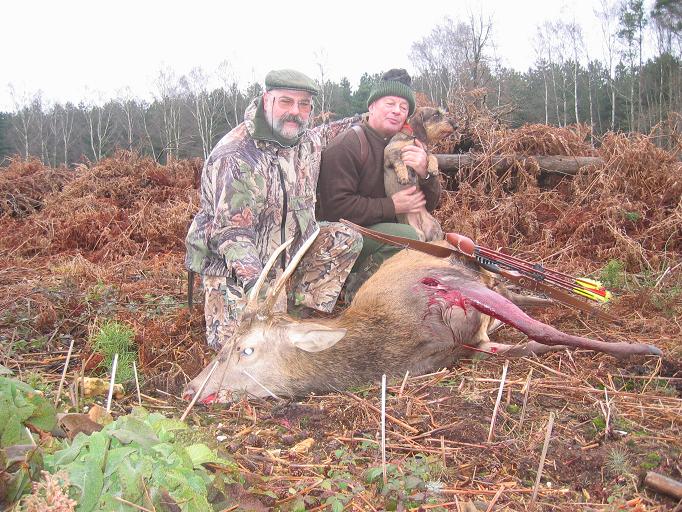 Je vois arriver Jacques qui me fait le geste { et alors ? ……} Je lui relate la rencontre. Je pense que ma flèche est correctement placée. Il s’agit maintenant de faire la recherche de l’animal. Nous trouvons rapidement une piste de sang abondante qui part en direction de l’endroit où je l’ai vu disparaître. Le teckel de Bernard tire sur sa laisse ( ça sent bon)… Enfin à plus de 150 mètres, nous le trouvons couché, mort. Je réalise enfin. J’ai tué mon premier cerf. La flèche est entrée derrière l’épaule droite au dessus du coude. Comme je l’ai tiré à genoux, la trajectoire de sortie se situe en haut de l’épaule gauche.