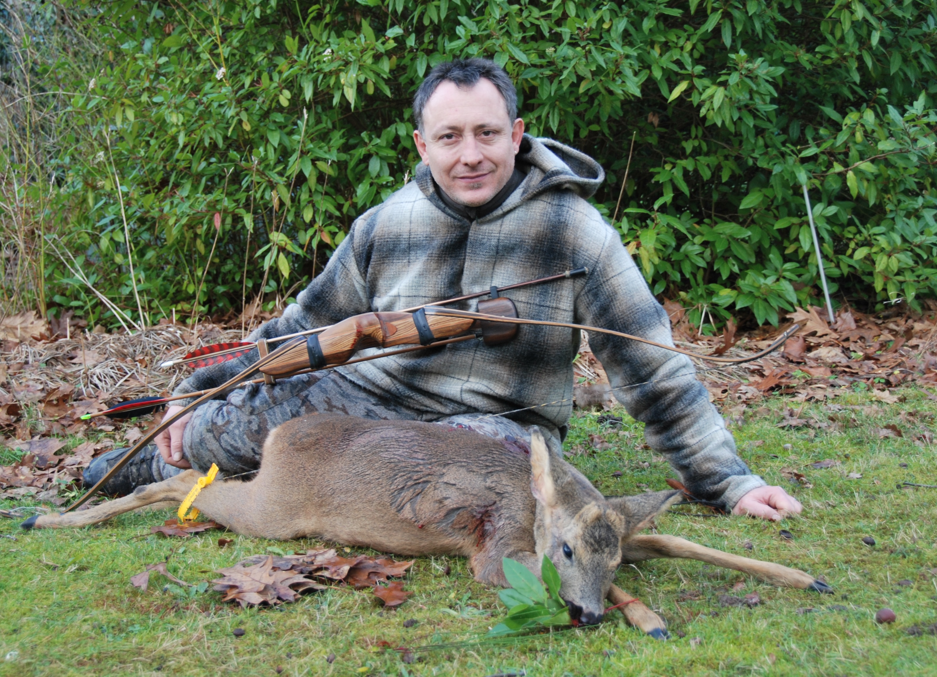 Je suis une grosse coulée qui me conduit au bord de la Loire, dans un endroit où les 4* 4 et autres tout-terrains s’amusent habituellement. Je pars de cet endroit et me dirige vers une ancienne sablière inexploitée depuis longtemps qui est devenue un lieu où vivent canards, castors et … toute une faune diverse et variée. Ce trou doit faire trois cents à quatre cents mètres de long sur cent de large et plus de vingt mètres de profondeur avec beaucoup de végétation autour. Je m’approche du bord en surplomb en espérant observer un castor et, à ma surprise, je vois deux culs blancs se déplacer, ce ne sont pas des naturistes : il fait trop froid, mais bien des chevreuils. Je recule et réfléchis à un moyen de les approcher, ma décision est prise, je m’engage dans une coulée, au milieu des genets et des ronces. Cette coulée me fait descendre dans le bas de la sablière, j’aperçois trois chevreuils sur ma gauche à quarante mètres. J’essaye de progresser vers eux quand je constate qu’un bras d’eau nous sépare. Je les observe un moment et fais demi-tour pour contourner le bras d’eau. En faisant demi-tour, j’ai perdu le contact visuel, je dois donc scruter chaque bosquet et, du coup, ma progression est très lente, mais je sais qu’ils sont là. Je ralentis encore ma progression quand j’arrive dans une petite cuvette que je remonte, le terrain est glissant et là, derrière, je vois un dos de chevreuil qui s’éloigne à une vingtaine de mètres, mon bras d’arc monte dans cette direction, il est trop loin maintenant ; un deuxième chevreuil le suit, puis un troisième et là, ma flèche part instinctivement. Le chevreuil s’écroule et tombe dans la pente : c’est fini. La pression redescend quand je vois sortir du bois non pas deux chevreuils, mais sept, qui s’arrêtent au milieu du pré comme pour attendre leur compagnon qui est resté définitivement dans le bois.