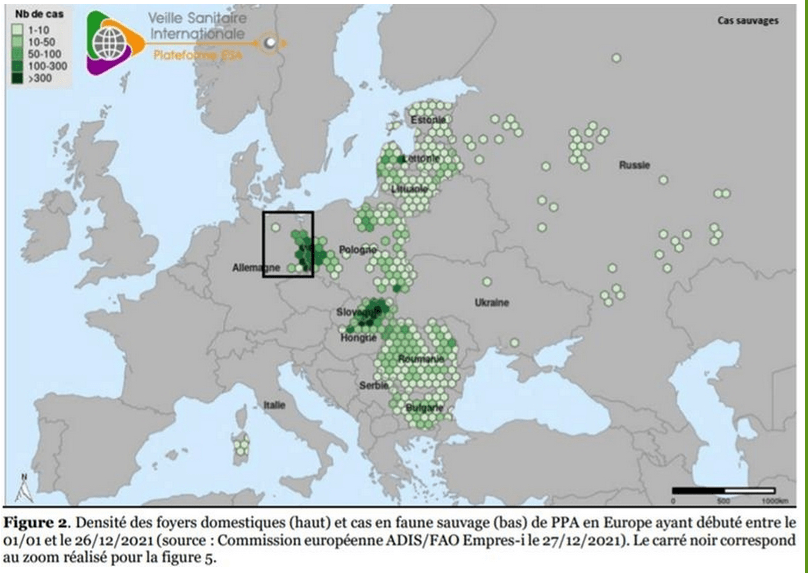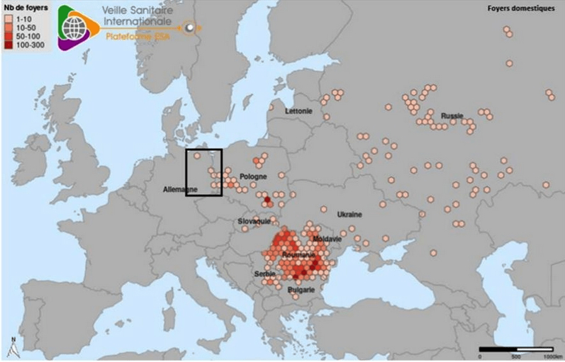 Depuis les premiers cas en Europe en 2014, à part la Roumanie et la partie « européenne » de la Russie ( à l’Ouest du 60ème parallèle), tous les pays d’Europe touchés déplorent principalement des cas en faune sauvage, et pour certains quelques foyers en élevages de suidés. Le virus reste actif et l’on recense régulièrement de nouveaux cas dans l’ensemble de ces pays, principalement Pologne, Hongrie, Slovaquie, Lettonie, Lituanie, Bulgarie, Serbie. Les deux cartes ci-dessous illustrent cette situation en élevages et en faune sauvage.